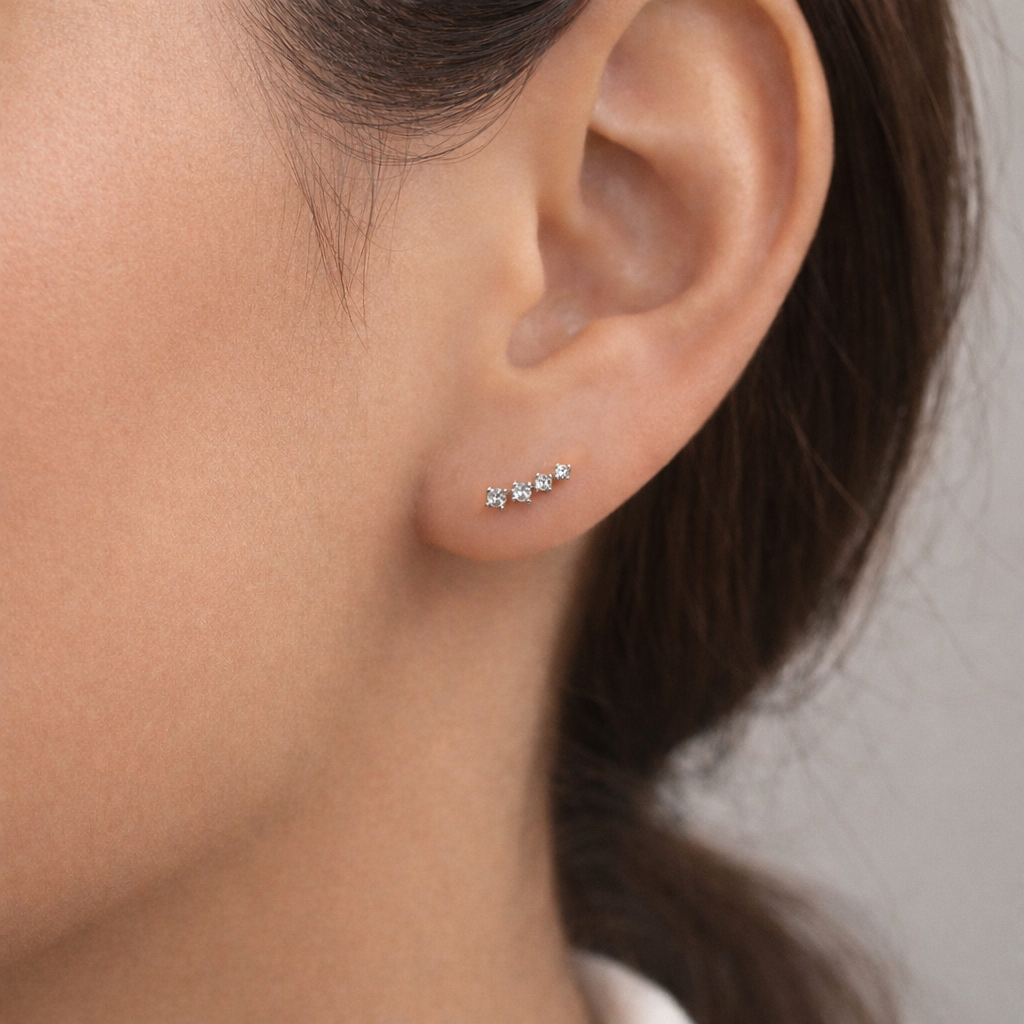 These elegant stud earrings feature a row of sparkling crystals, creating a long singular piercing. Perfect for everyday wear or a special occasion, these earrings provide a stunning look alone, or extra special paired with others in a stack.